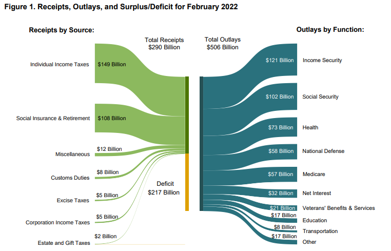 But the elite ruling class in the USA, drunk with power, corrupt, and compromised just keep spending more and more at a faster and faster rate. Take a look at the graphic below showing receipts and outlays for February 2022. The government received $290 billion and spent $506 billion. Or more simply put, for every dollar the USA government received in Feb 2022, it spent $1.74 (compared to $1.68 in 2021)