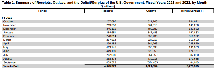 Just have a look at this table below to Receipts and Outlays for 2021. It shows the government received $4.045 trillion from all sources but spent $6.821 trillion. So in 2021 alone it spent $2.775 trillion more then it received.
